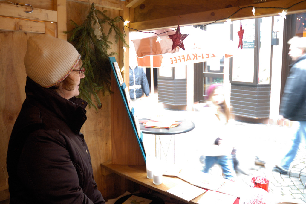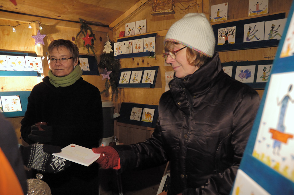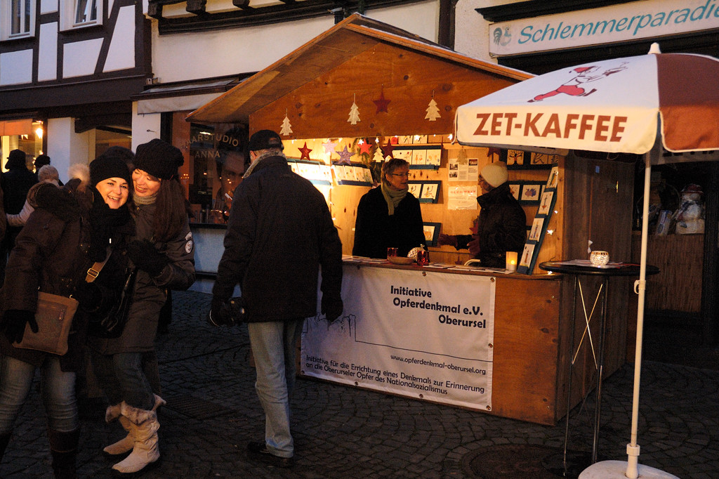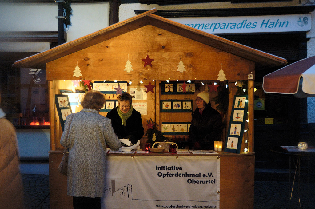 Der erfolgreiche Verkauf der Fliesen während des „Sommers in der Strackgasse“ hat uns dazu bewogen, am diesjährigen Weihnachtsmarkt am ersten Adventswochenende in Oberursel teilzunehmen, um weitere Einnahmen für unser Denkmal zu erwirtschaften. Annette Andernacht entwarf speziell für den Weihnachtsmarkt zusätzliche Motive und stellte auch diese für einen Spendenverkauf zur Verfügung.