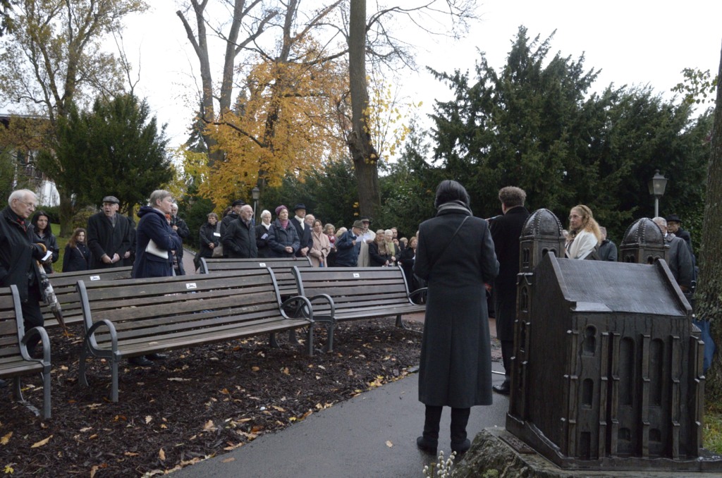 Im Anschluss begann der offizielle Gedenkakt mit einer Festrede von Frau Staatsministerin a. D. Ruth Wagner und Beiträgen aus Schulen im Hochtaunuskreis sowie des Chors „Entrüstet Euch“. Zum Abschluss der Veranstaltung gingen alle gemeinsam zum Synagogenmodell im Königsteiner Kurpark.