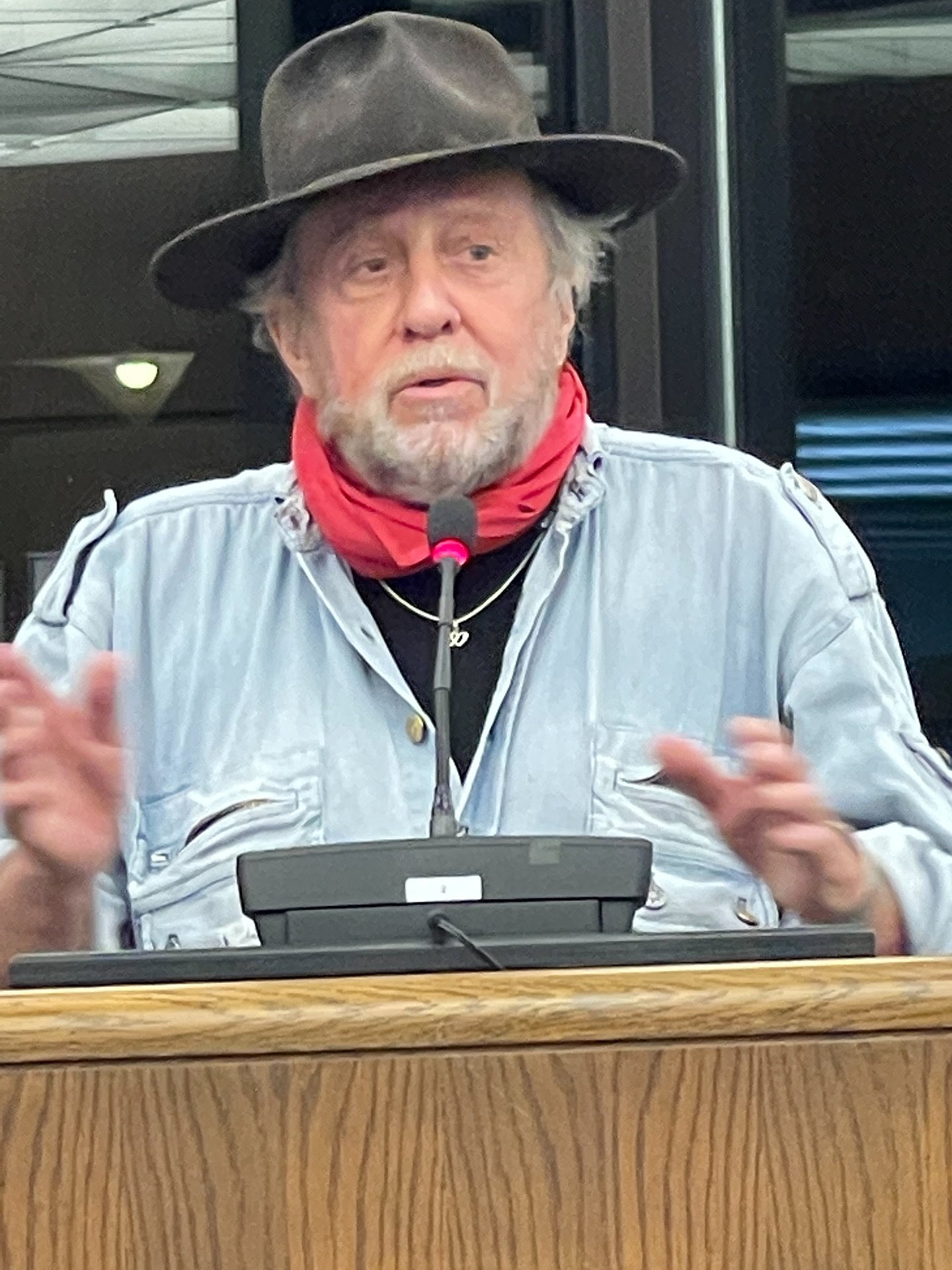 Am Rednerpult Gunter Demnig. Projekt Stolpersteine Oberursel. Informationsabend am 2. März 2022 im Rathaus, dem Abend vor der Verlegung, mit dem Initiator der Stolperstein-Aktion, Gunter Demnig, Bürgermeisterin Anje Runge, der Kreisvorsitzenden der Gesellschaft für Christlich-Jüdische Zusammenarbeit, Angelika Rieber, Vertreter/innen der Feldbergschule mit Schulleiter Peter Selesnew, und den Lehrer/innen Anja von Cleef, Heiko Rohde, Tom Erdmenger und Mark Menges.