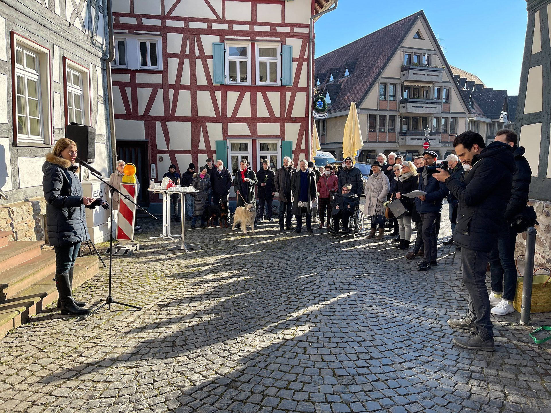 Am 3. März 2022 verlegte der Künstler Gunter Demnig gemeinsam mit Bürgermeisterin Antje Runge und Schülerinnen und Schülern der Feldbergschule die ersten fünf Stolpersteine am Marktplatz 7, dem ehemaligen Wohnsitz der Familie Feinberg. Im Anschluss wurde vor dem Haus in der Freiligrathstraße 11, dem ehemaligen Wohnsitz von Cäcilia Pagel, und in der Siemensstraße 3, dem ehemaligen Wohnsitz von Bertha Röder, jeweils ein Stolperstein verlegt.