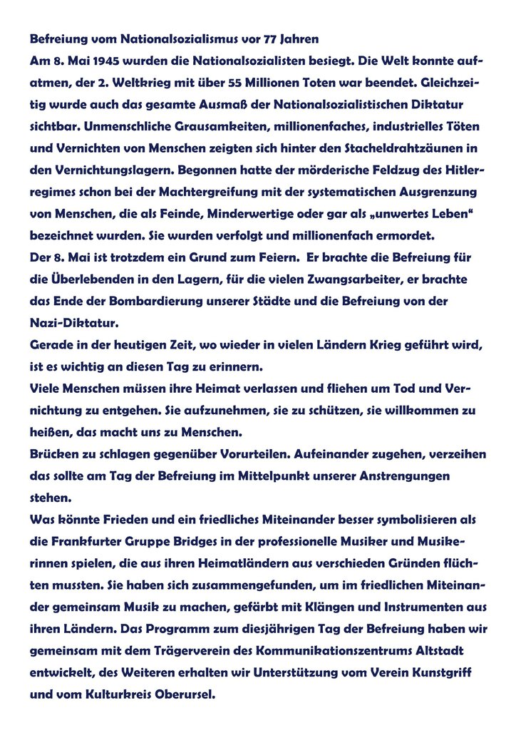 Was könnte Frieden und ein friedliches Miteinander besser symbolisieren als die Frankfurter Gruppe Bridges in der professionelle Musiker und Musikerinnen spielen, die aus ihren Heimatländern aus verschieden Gründen flüchten mussten. Sie haben sich zusammengefunden, um im friedlichen Miteinander gemeinsam Musik zu machen, gefärbt mit Klängen und Instrumenten aus ihrem Land. Das Programm zum diesjährigen Tag der Befreiung haben wir gemeinsam mit dem Trägerverein des Kommunikationszentrums Altstadt entwickelt, des weiteren erhalten wir Unterstützung vom Kulturkreis Oberursel und vom Verein Kunstgriff.